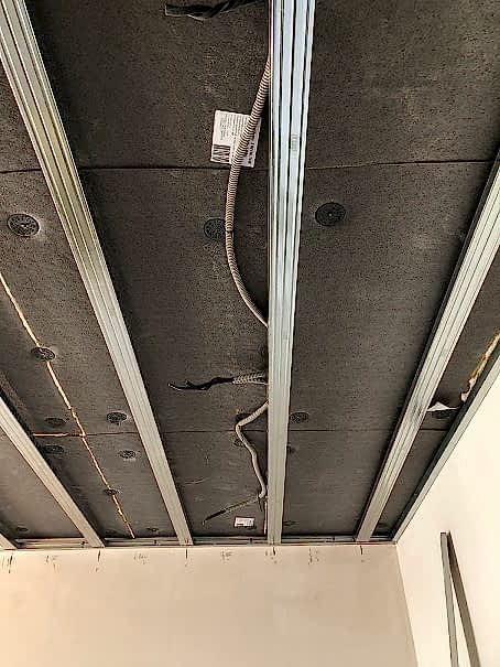 После этого устанавливается каркас из потолочных и направляющих профилей, который обшивается гипсокартоном. Такой способ дает прибавку 90-100 мм к основанию, соответственно, цена за метр шумоизоляции стен в квартире также Pin Up выше.