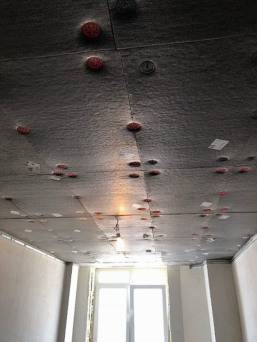 Если ремонт производится в просторном помещении, изолируются не только стены, но и потолок. Это позволит значительно снизить и уровень акустических и ударных шумов от соседей сверху. В этом случае сначала монтируются плиты торговой Pin Up «Евроблок». Все швы также обрабатываются пеной и герметиком.